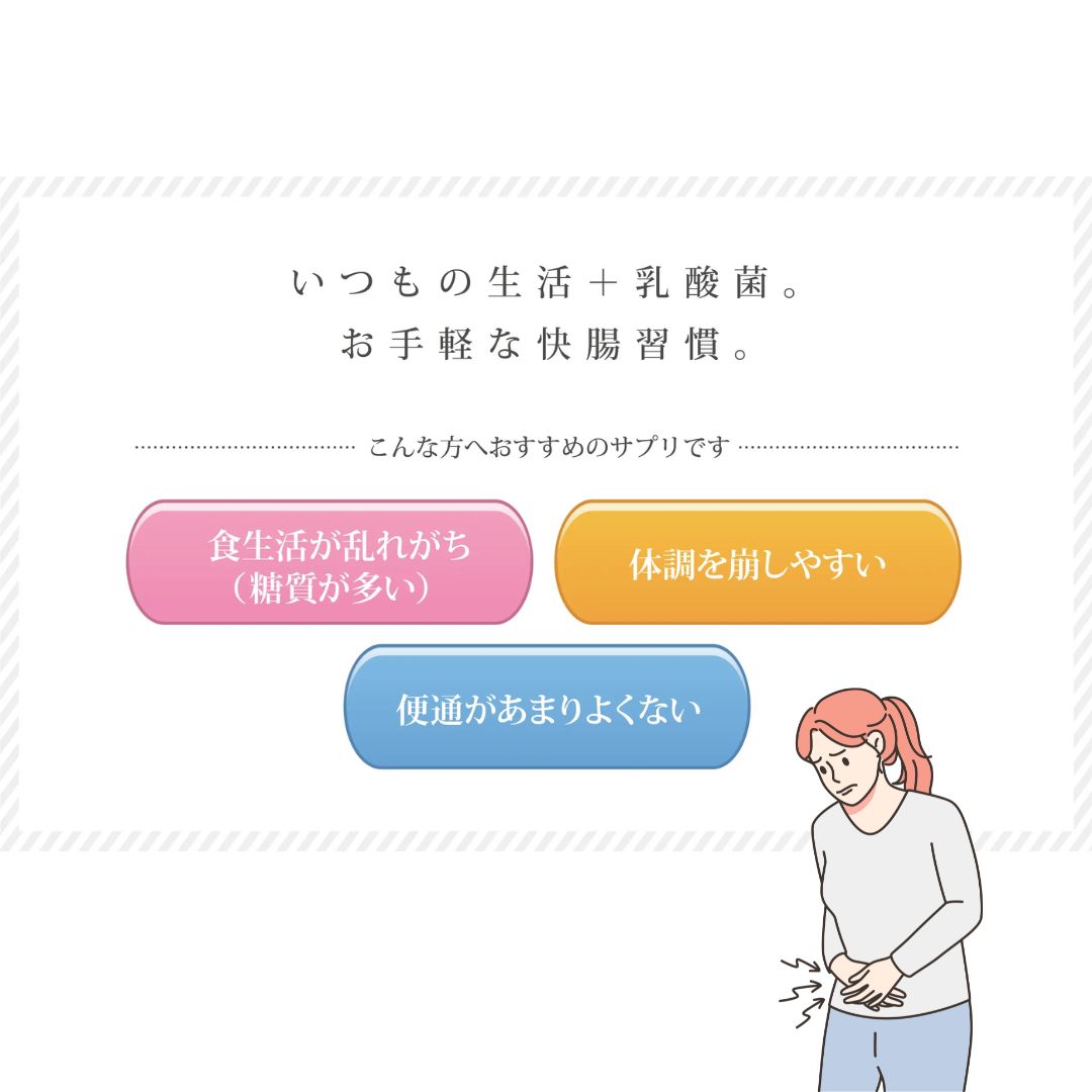 | 原材料 | デキストリン(国内製造)、乳酸桿菌発酵液(乳成分・大豆を含む)、乳酸菌粉末/プルラン |