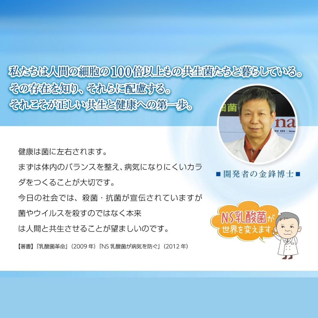 | 配合菌株(NS乳酸菌) | NS-6株(ラクトバチルス・カゼイ) NS-7株(ラクトバチルス・ロイテリ) NS-8株(ラクトバチルス・ヘルベティクス) NS-9株(ラクトバチルス・ファーメンタム) |
