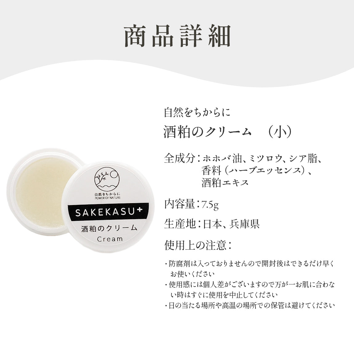 ホホバオイルとシアバターをベースに、兵庫県宝塚産大吟醸酒粕を贅沢に使用した無添加のクリームです。酒粕の持つ効果で、杜氏さんのようなしっとりと滑らかなお肌へ。