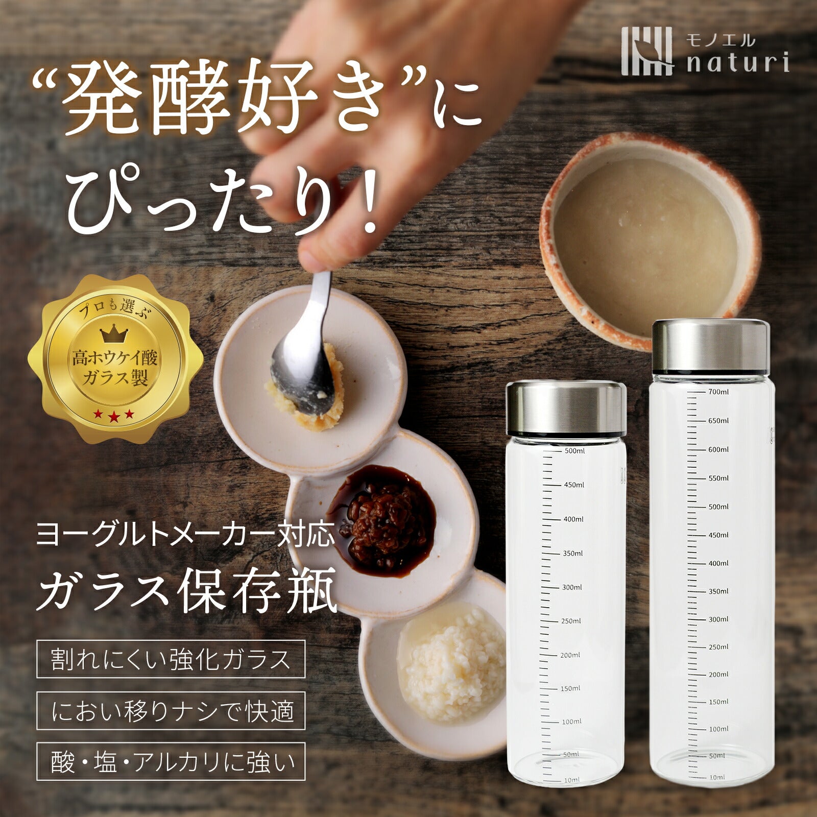 実験器具や哺乳瓶にも使われる「高ホウケイ酸ガラス」を採用。-20~150℃まで耐える強化設計で、酸・塩・アルカリにも強く、におい移りしにくいから発酵食品の保存に最適。